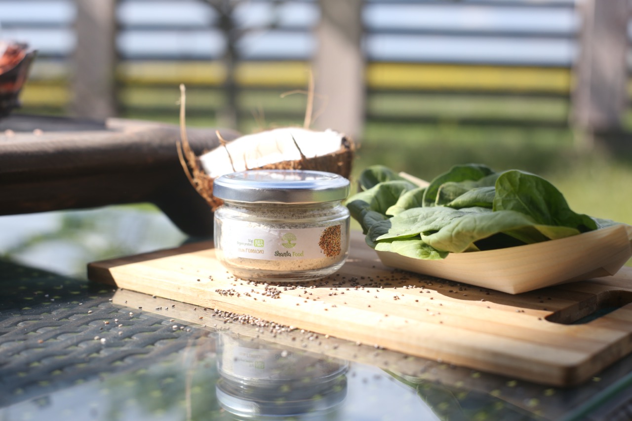 Гомасио : представляет собой смесь перемолотого кунжута и гималайской соли мелкого помола. В составе – кальций, магний, железо, цинк, а также витамины – A, C, E, B, фолиевая кислота. Не только делает пищу соленой – ее добавляют в еду, чтобы нормализовать давление, сдержать образование вредного холестерина, оздоровить печень, лучше усвоить пищу. Может использоваться для приготовления салатов, основных блюд, гарниров, идеально подходит для выпечки. Идеально заменяет соль, привнося вкус и аромат.